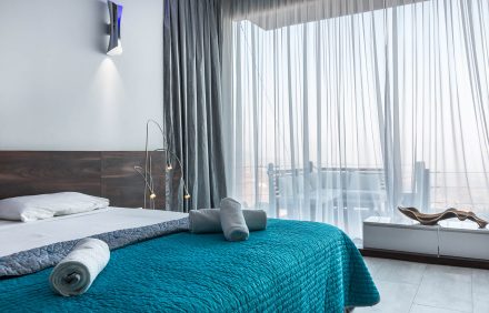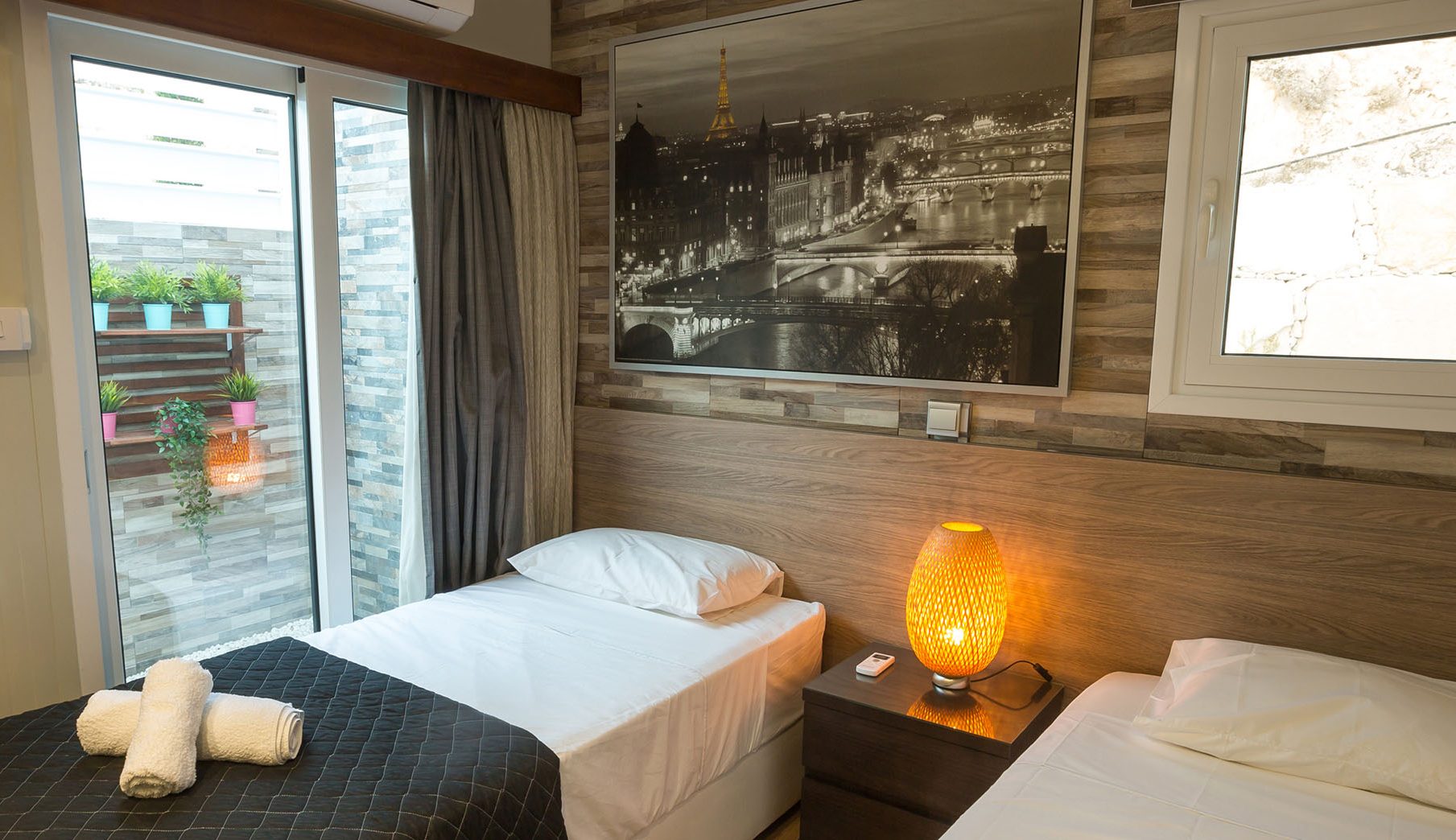 The master bedroom with an ensuite shower room provides ultimate privacy for couples, while the twin bedroom with two large single beds is perfect for indulging in your own world of dreams. Natural light fills the rooms through large glass doors, allowing you to enjoy the panoramic view with your favorite drinks.