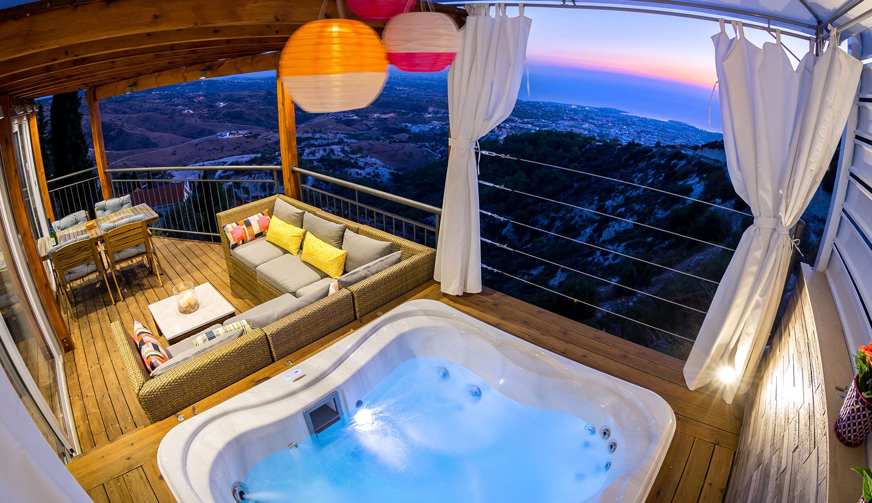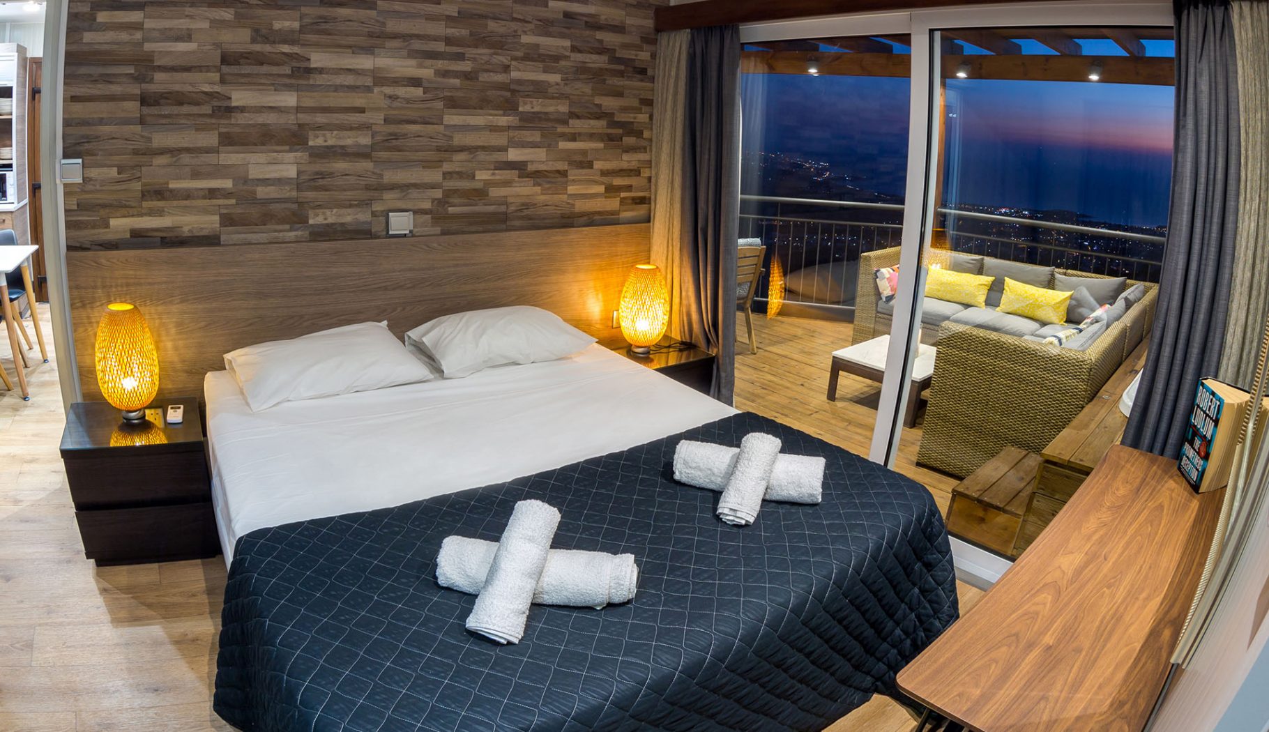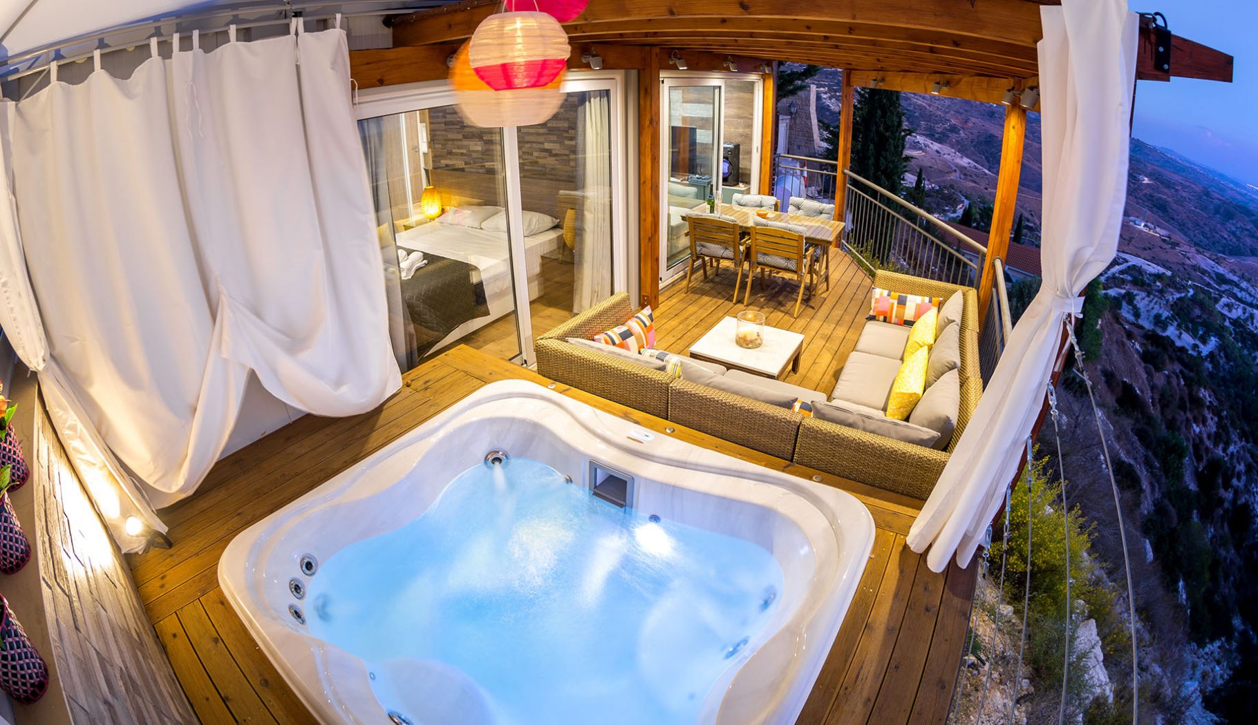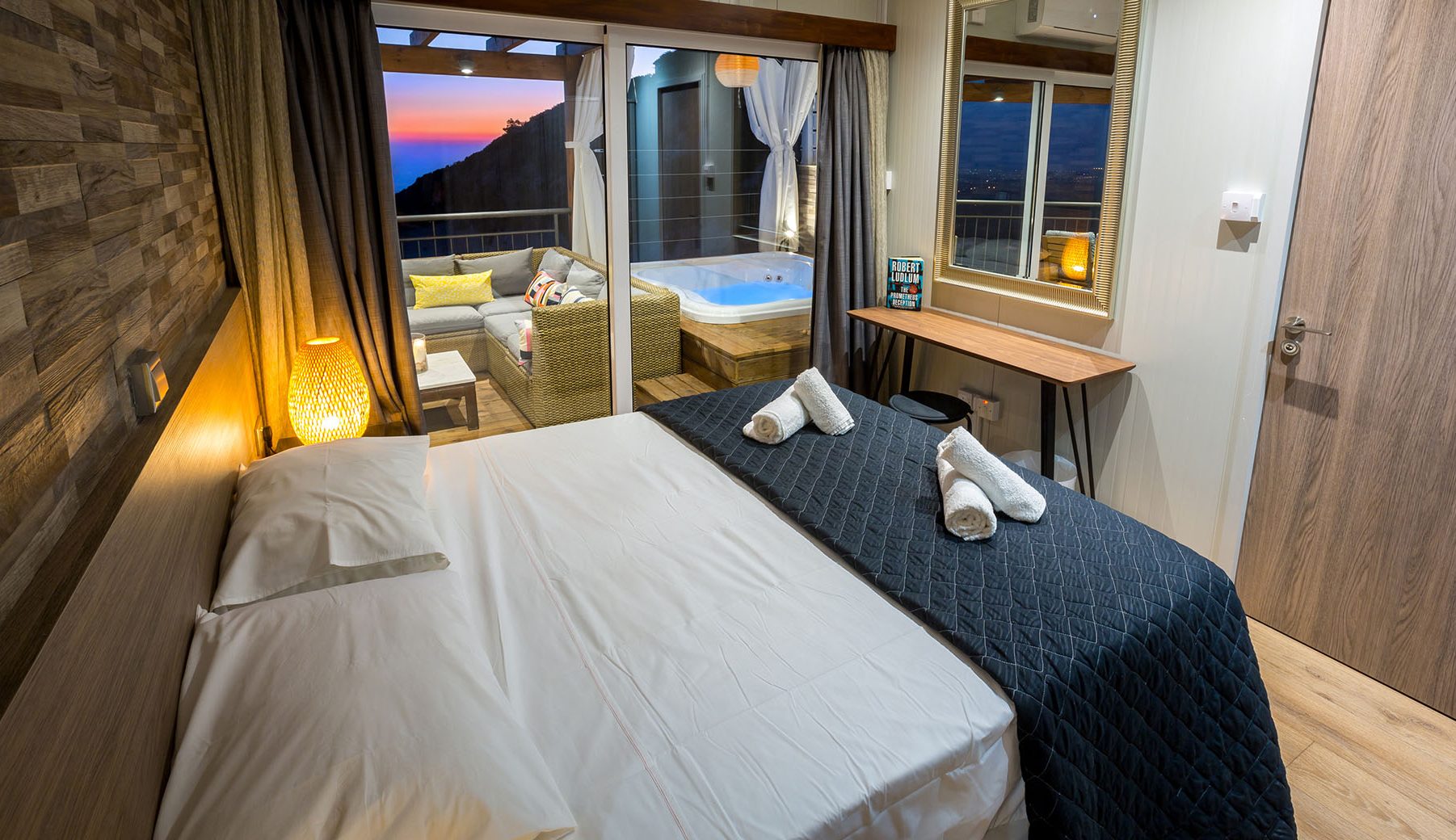 To add a touch of warmth, the main bedroom opens up to the outdoor Jacuzzi—an epic detail of Panorama Edge. Positioned on the edge of the mountain cliff with a raised wooden floor, it offers guests total luxury and privacy.