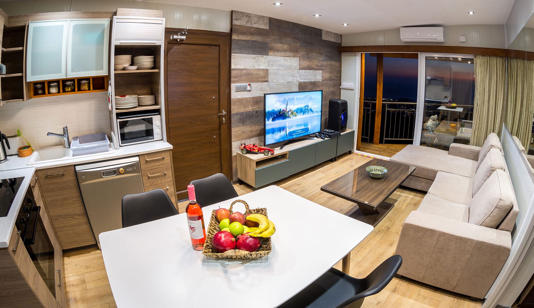 Guests can also savor the Mediterranean Sea view and the panoramic view of Paphos from the living room. The open-plan room combines a luxury kitchen, making it a perfect space for entertainment. Relax on the large comfortable sofa, enjoy your favorite shows on the large TV with a Hi5 sound system, or play PS4. Panorama Edge caters to the satisfaction of people of all ages.