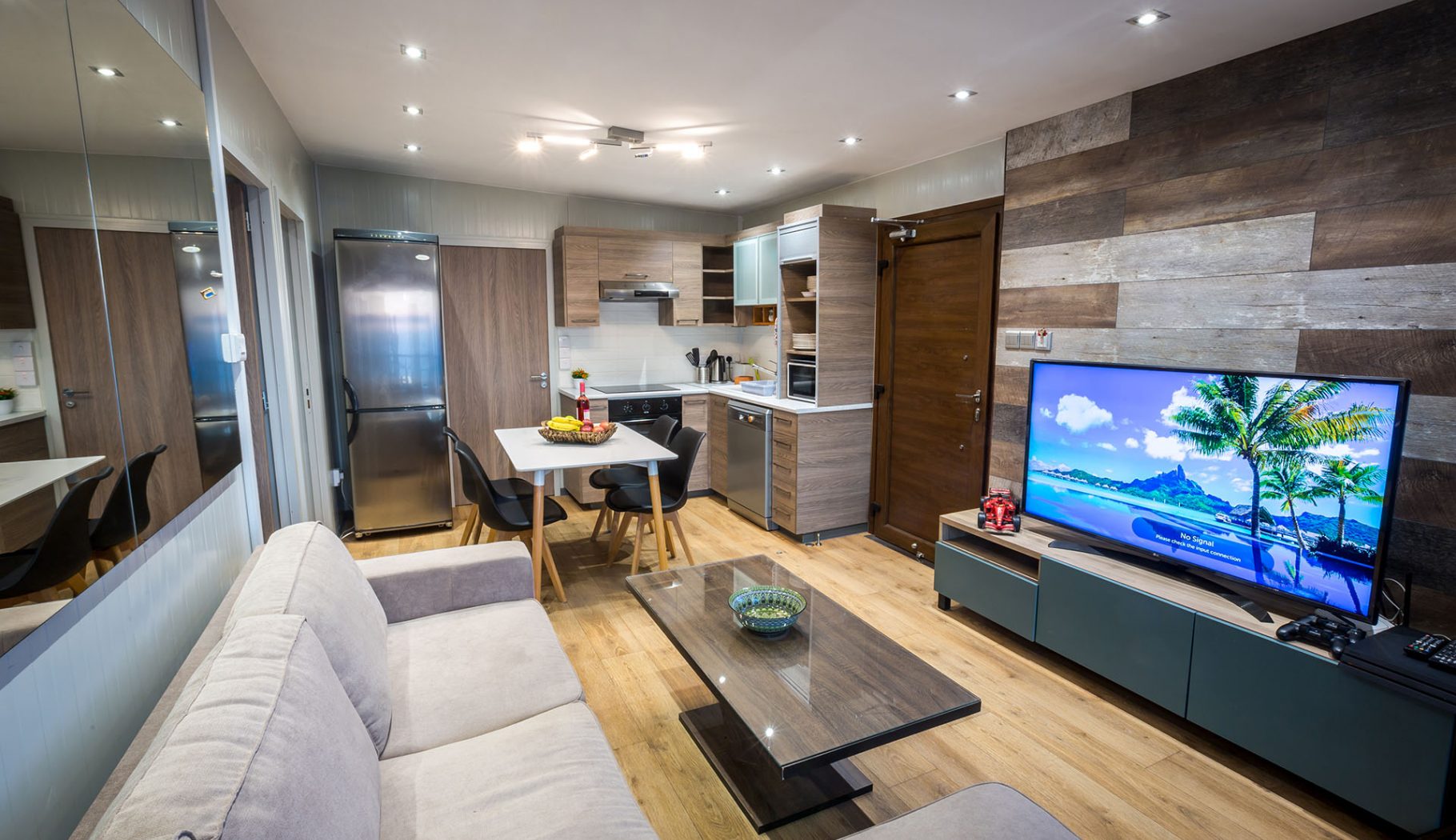 This modular villa features a master bedroom with an en-suite bathroom, a twin bedroom, an additional common bathroom, a luxurious kitchen, a cozy living room, and an outdoor hot tub Jacuzzi for intimate moments with complete privacy.