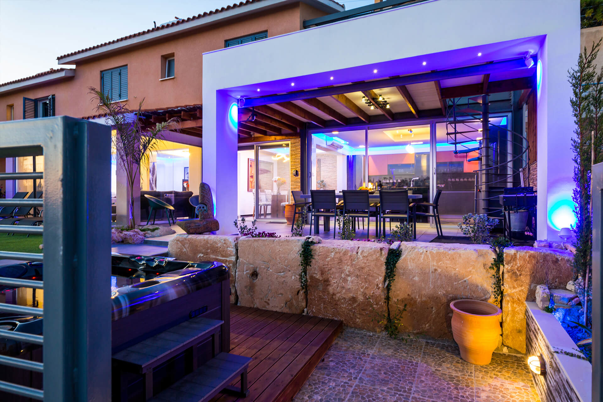On the ground floor the villa features a stylish open plan kitchen with all the necessary equipment’s and tools needed to prepare any type of meal. Together with the kitchen is the indoor dining area that seats up to 8 people. The combination of the open plan kitchen and dining area offers a comfortable and relax environment for your function.