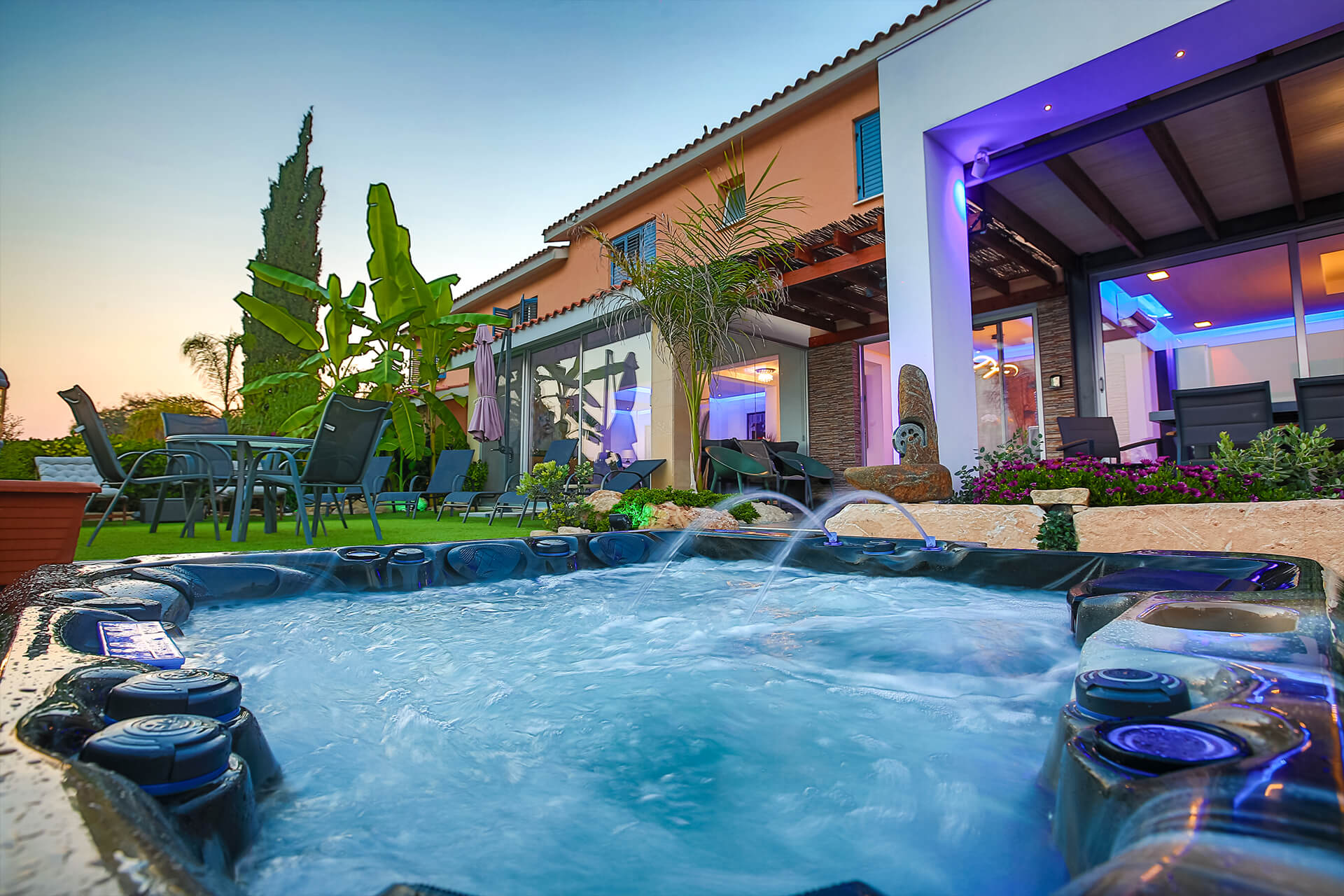 However the center of attention goes to the luxury private hot/cold tap Jacuzzi with different massage modes .