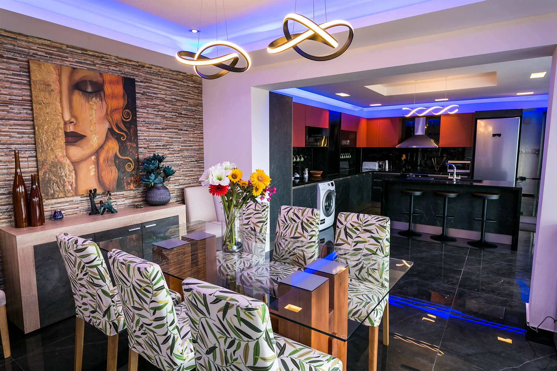 The living room was designed with modern and artistic materials such as artistic wall paints, rugs, mirrors therefore every corner has a story to tell.