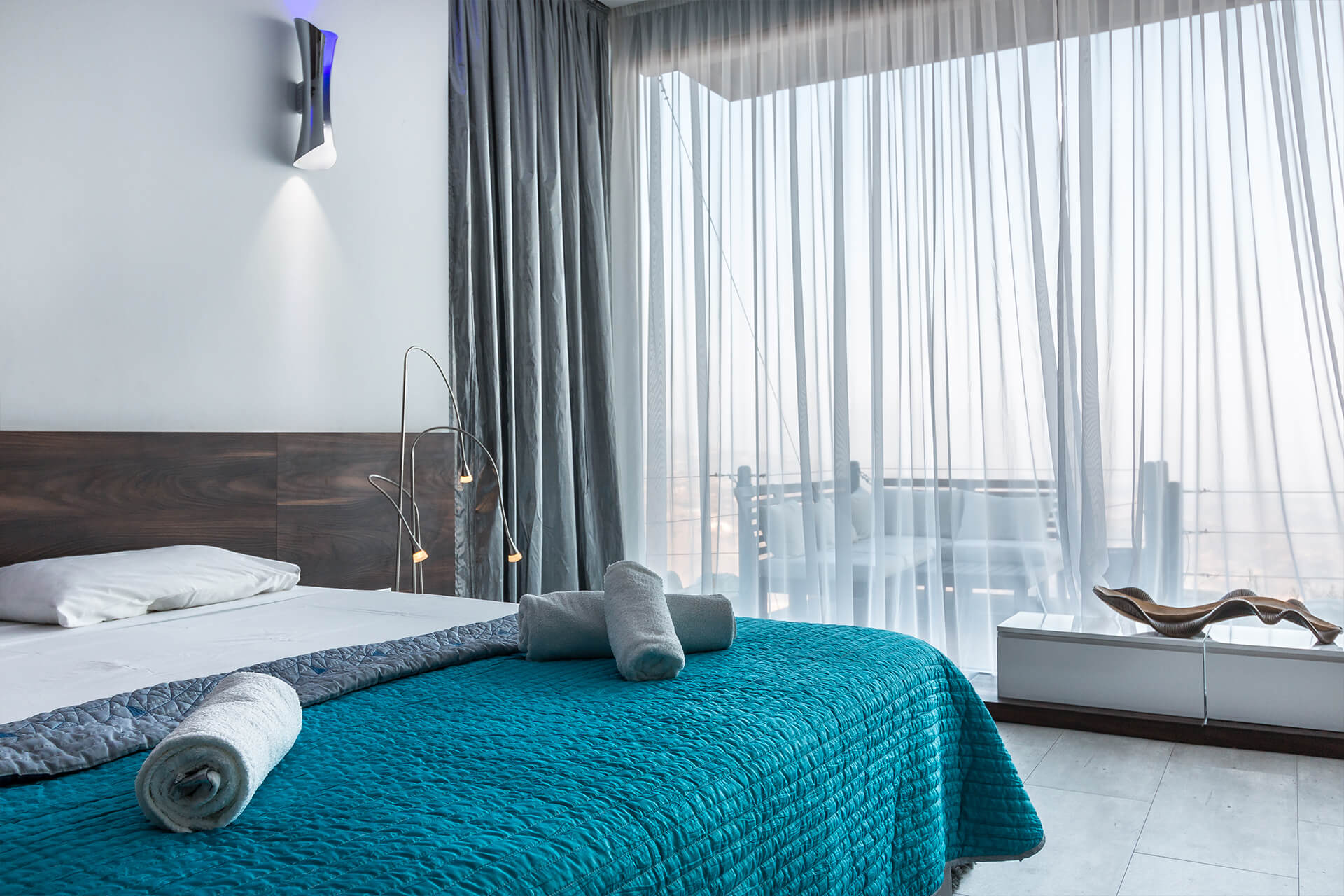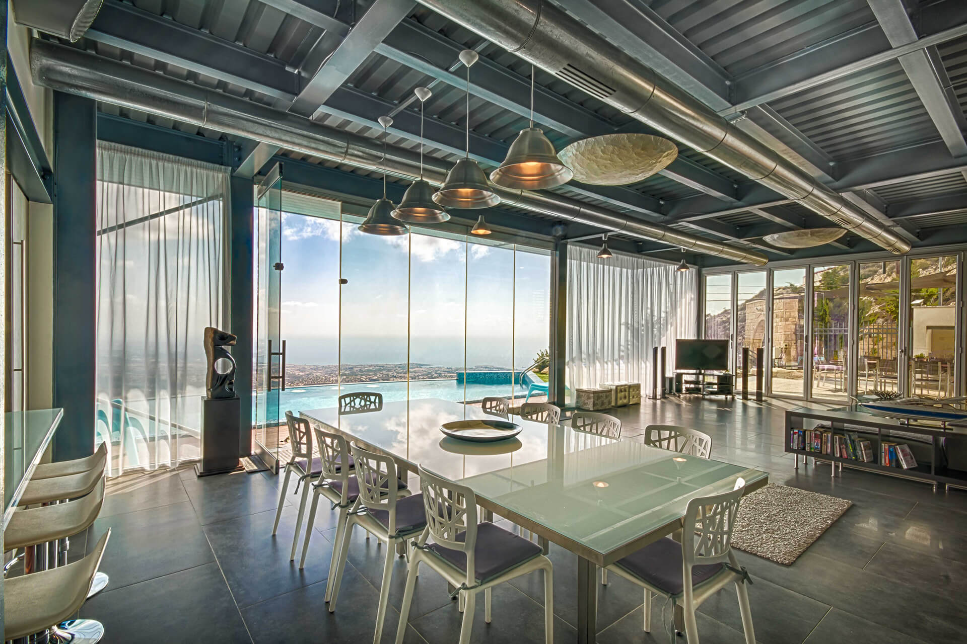 Sit back at the comfortable large couch and as watching your favorite series at the 52’’TV, gaze out from the glass and admire the Panoramic Mediterranean view. The kitchen is fully equipped with cooker, microwave and dish-washing machine. The villa has one master bedroom with a king size bed and en-suite bathroom. A comfortable twin bedroom with two single beds and extra bathroom is also there. The outside seating area is almost hanging at the Edge of the cliff and has a dining table with a comfortable outdoor sofa for romantic nights of relaxation.