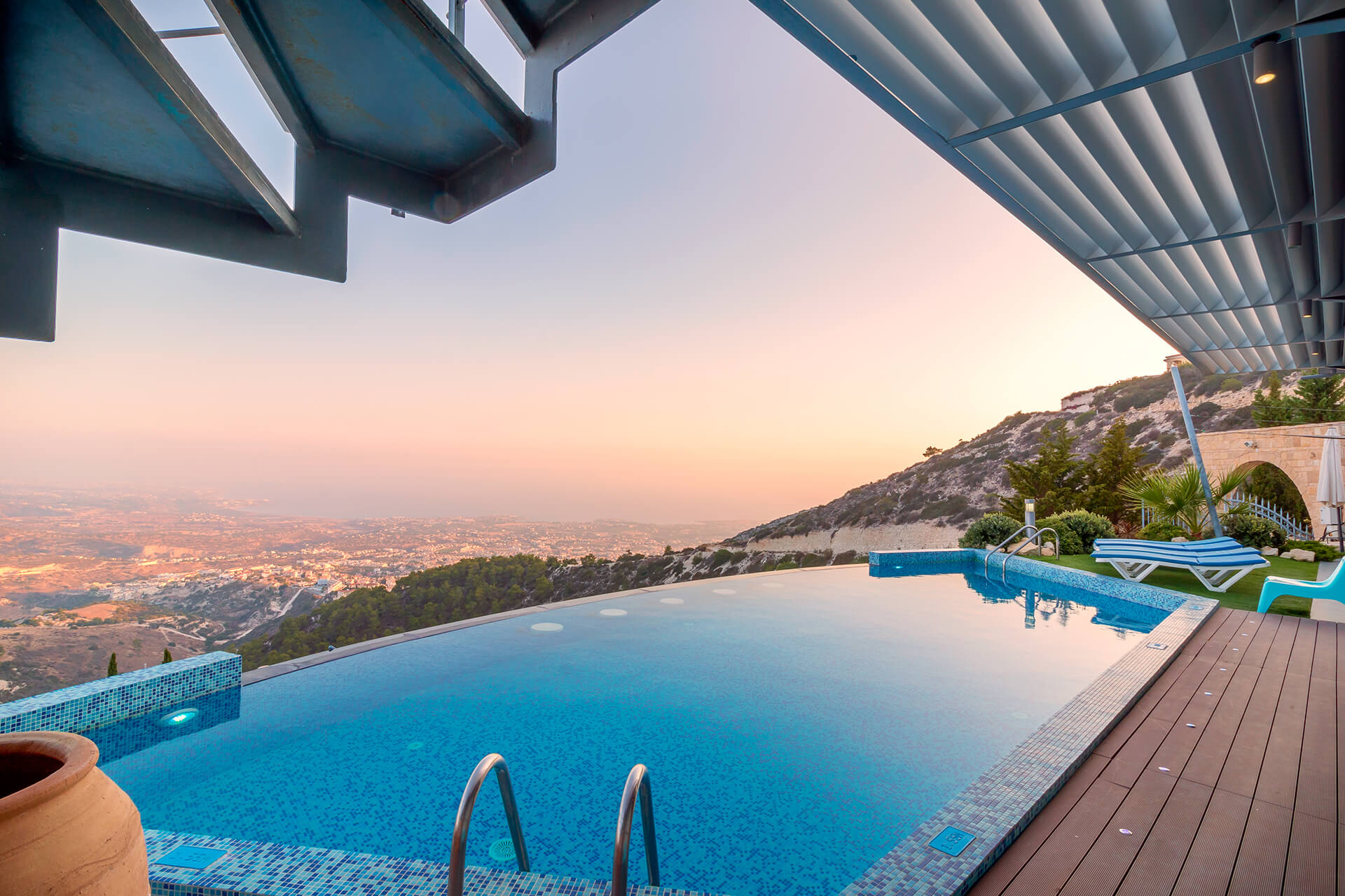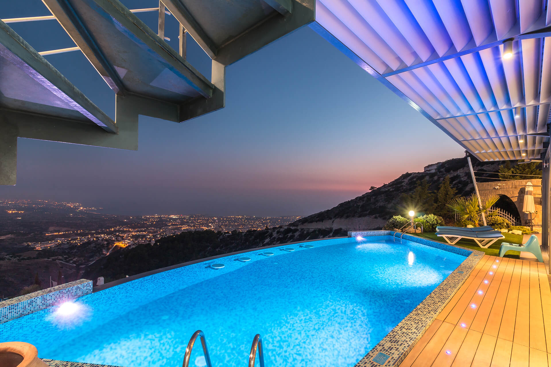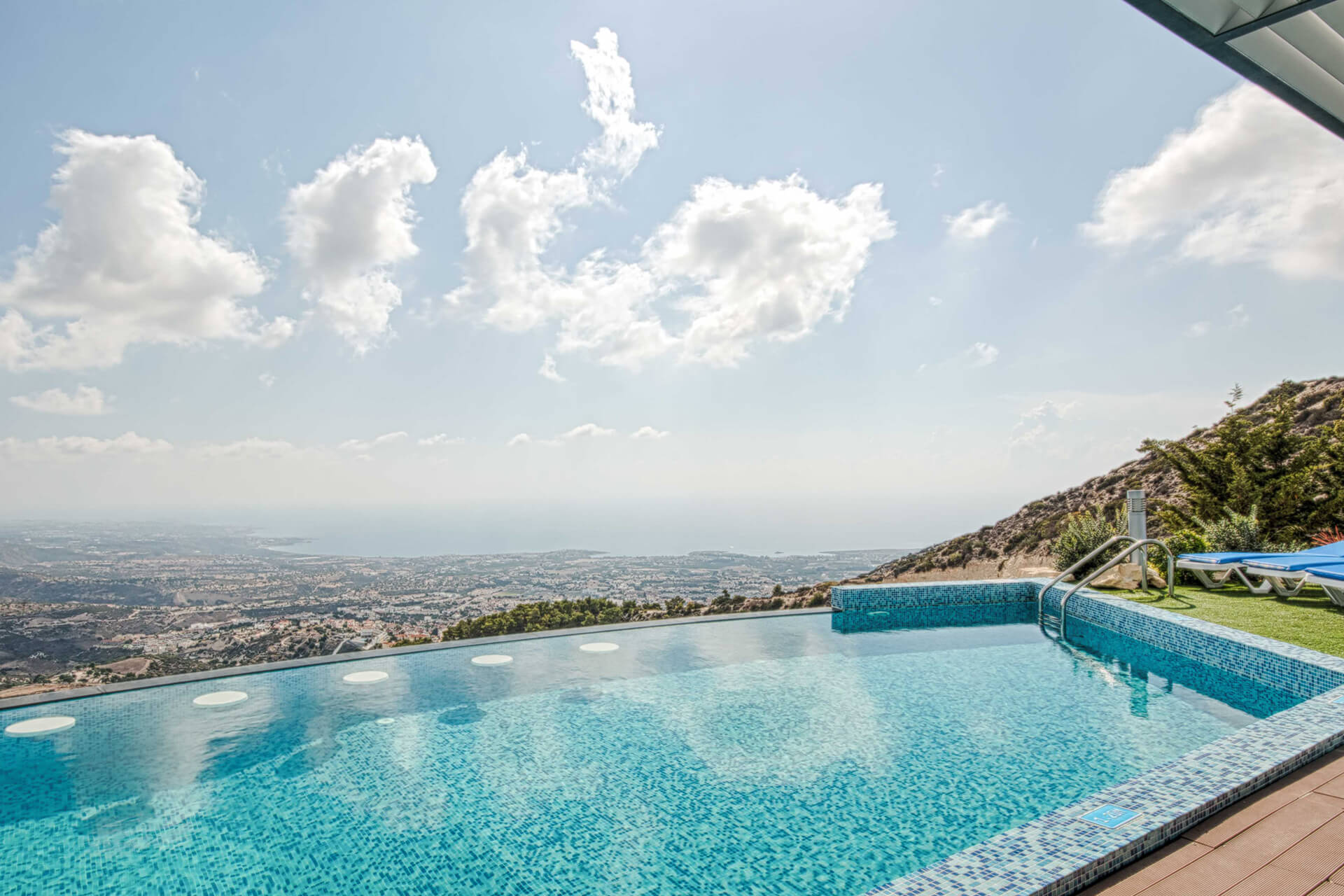 With contemporary materials, such as wooden floors, decorative wall panels and the deep comfy living room couch, the interior spaces offer a friendly and family environment. Located at the Edge of Peyia Hills Mountains, this comfy, luxury villa is finely atuned with the surrounding. The glazing doors of the main living room and master bedroom lets you enjoy the astonishing view of the Mediterranean from the inside as well.
