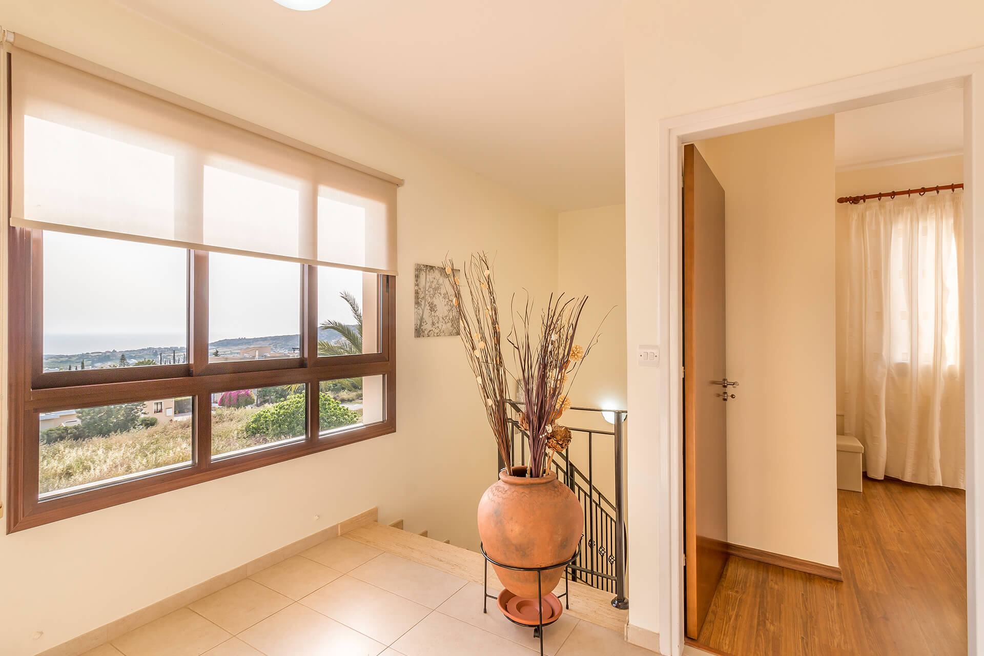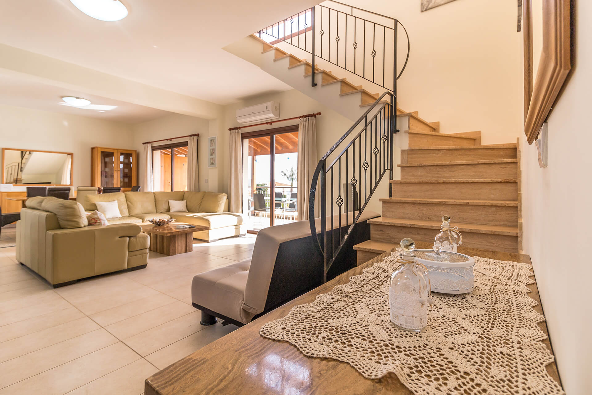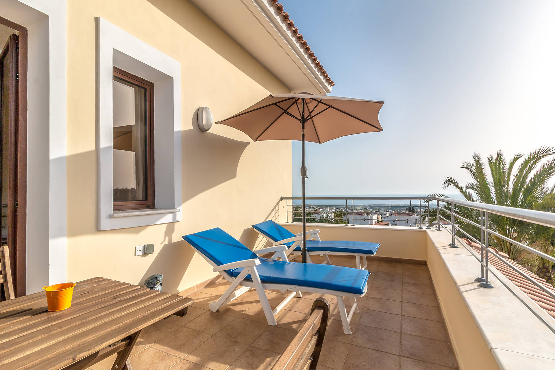 Going to the first floor you will find the large double bedroom with en-suite bathroom and it’s balcony, the twin bedroom with a Mediterranean Sea facing balcony, a twin bedroom and a large bathroom. This luxury villa can accommodate 8 to 10 people and is perfect small family gatherings.